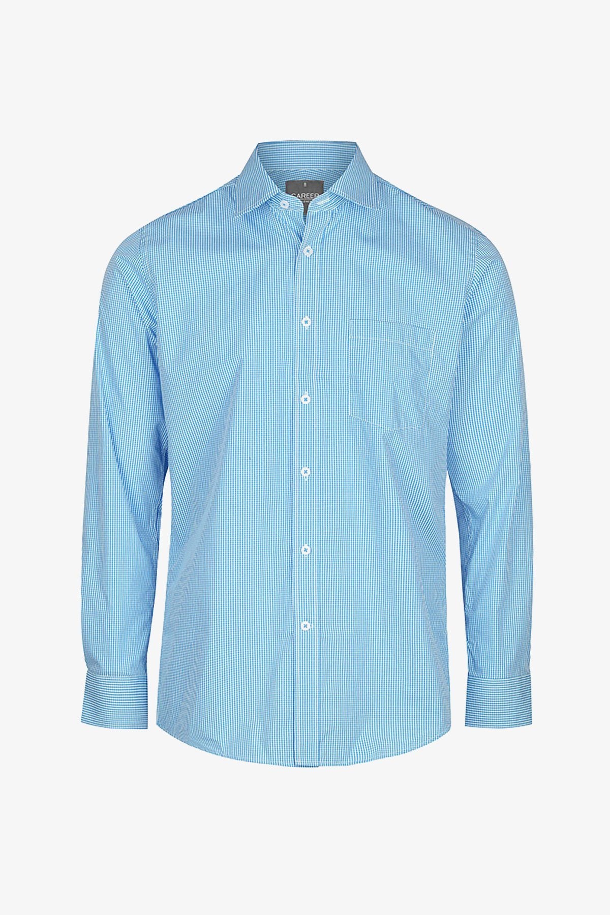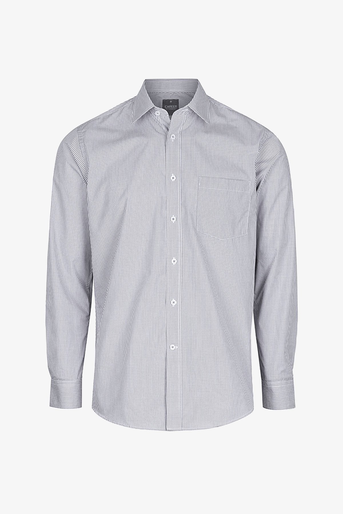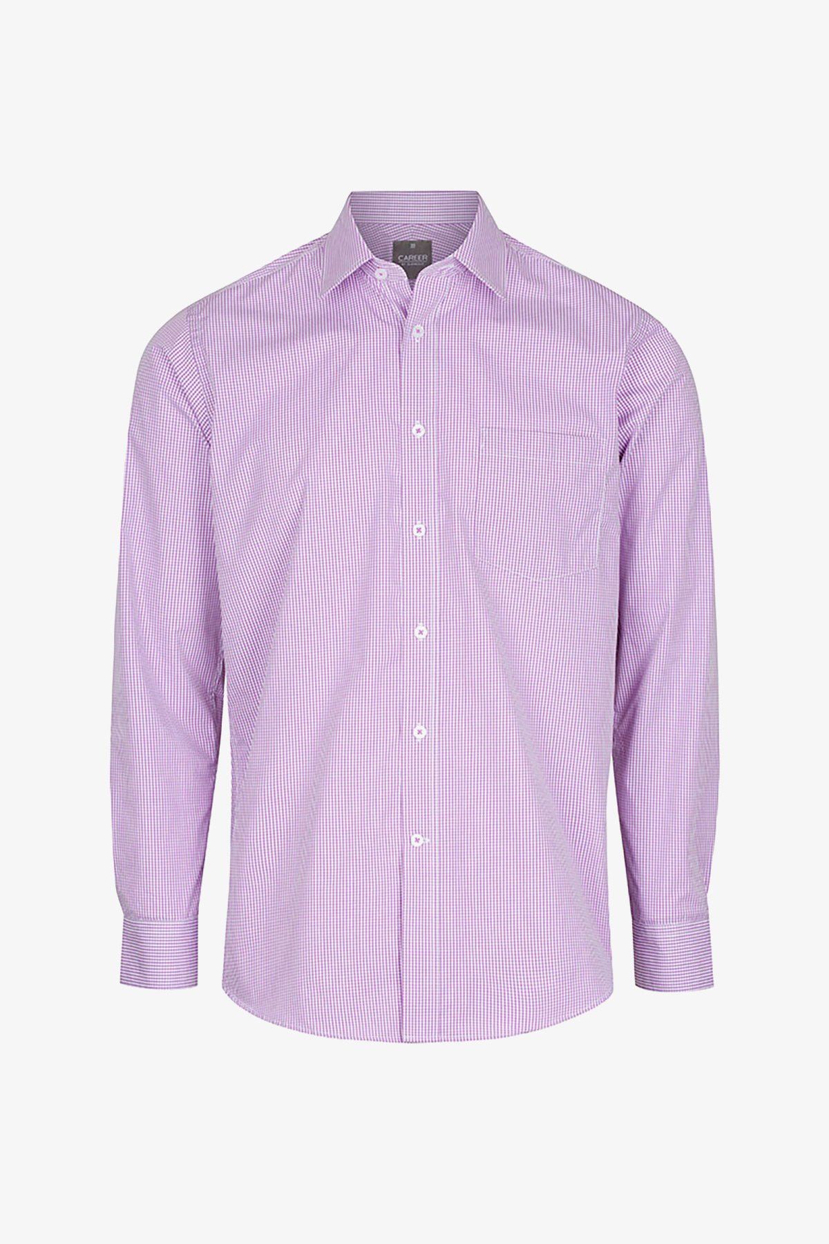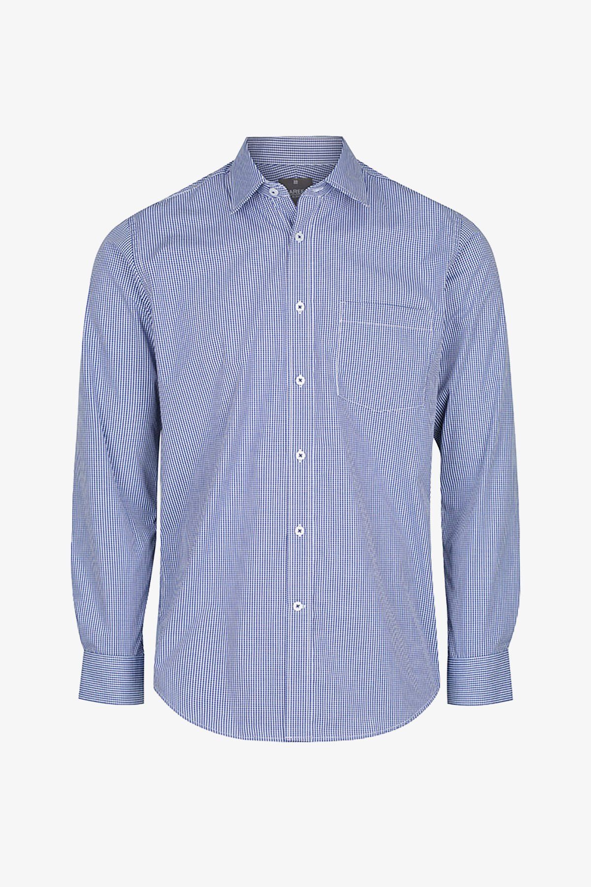 Contemporary fit premium gingham business shirt with an easy iron finish. Has a chest pocket, contrast inside yoke and cuffs. Features a convertible cuffs for cufflinks.