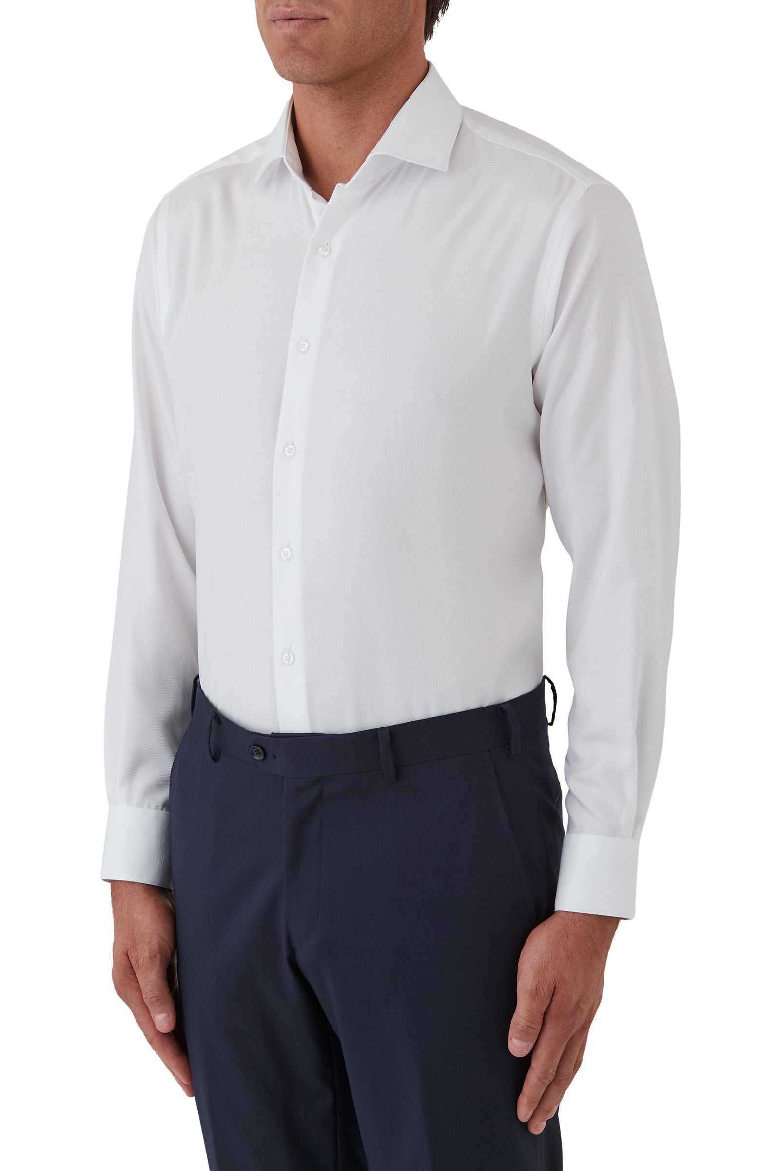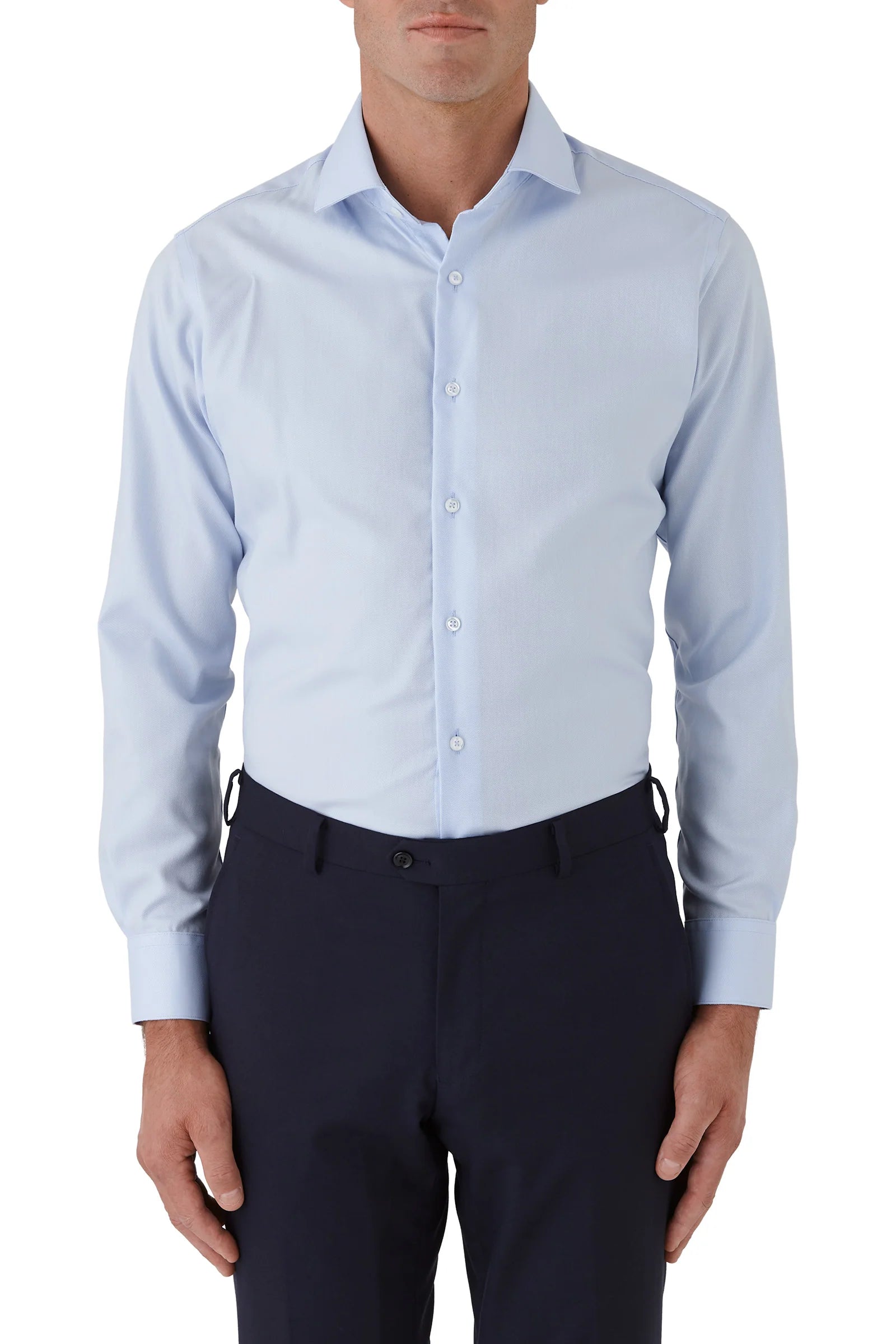 A twill textured shirt that is designed with the modern gentleman in mind. Featuring an elegant Italian cutaway collar and button cuffs, the Benjamin luxury twill shirt exudes sophistication with a touch of timeless charm. The absence of a pocket adds to its sleek and clean appearance. Crafted from wash & wear premium cotton, a 100% cotton fabric known for its easy-care properties, this shirt is perfect for the busy individual.
