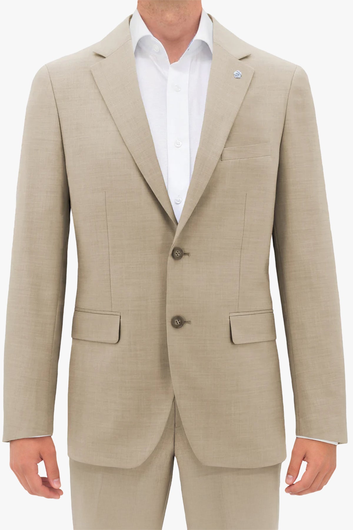The Louis/Dean Suit  is a tailored fit suit with a sand colour palette. The jacket is single-breasted with flap pockets and a notch lapel. The trouser is tailored with two front pockets and rear buttoned pockets