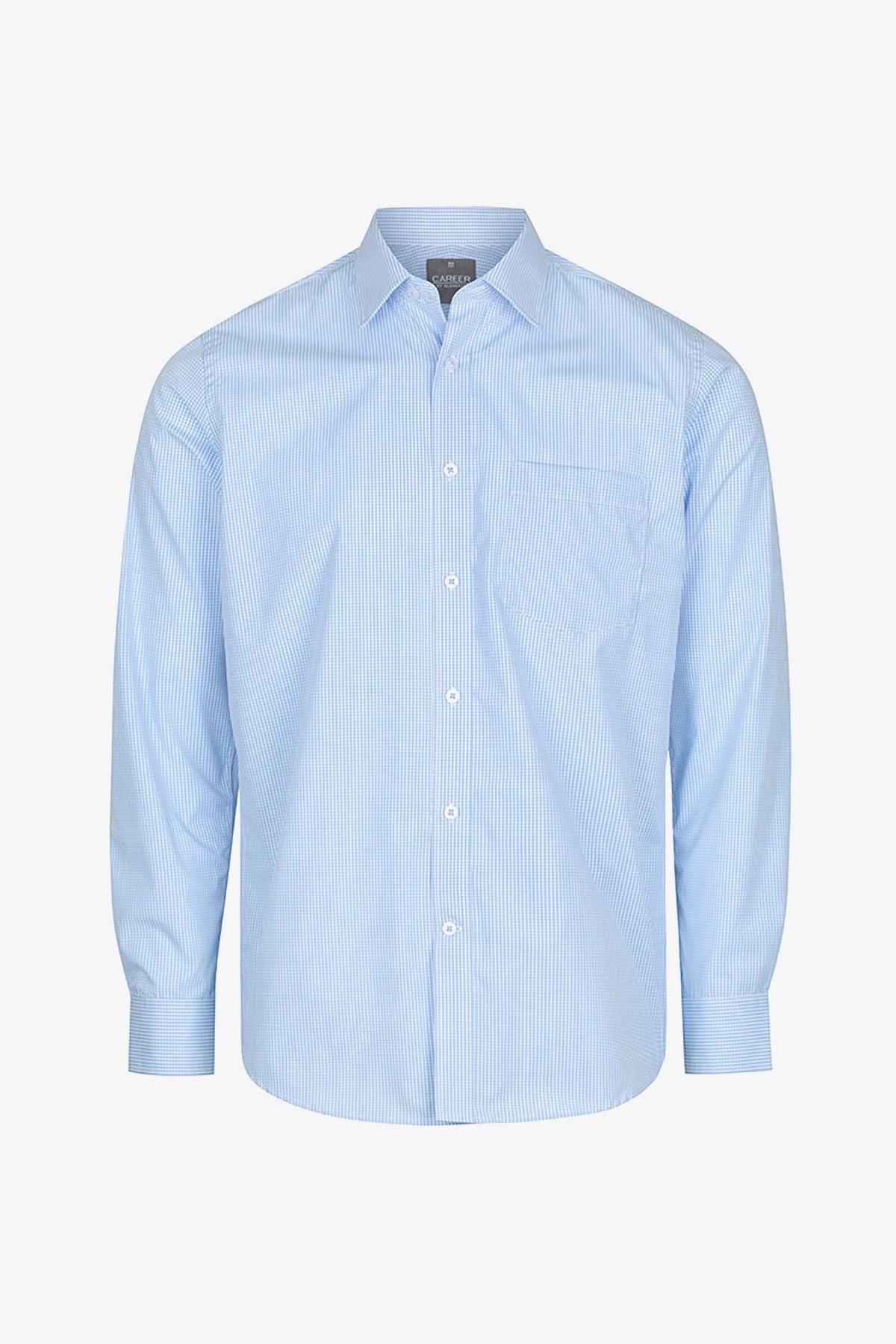 Contemporary fit premium gingham business shirt with an easy iron finish. Has a chest pocket, contrast inside yoke and cuffs. Features a convertible cuffs for cufflinks.